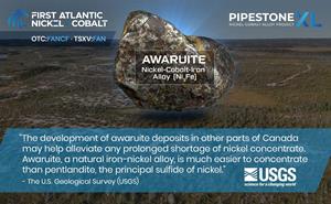 The U.S. Geological Survey recognized awaruite's strategic importance in its 2012 Annual Report on Nickel, noting that these deposits may help alleviate prolonged nickel concentrate shortages since the natural alloy is much easier to concentrate than typical nickel sulfides. The Pipestone XL Nickel-Cobalt Alloy Project is located near existing infrastructure with year-round road access and proximity to hydroelectric power. These features provide favorable logistics for exploration and future development, strengthening First Atlantic's role to establish a secure and reliable source of North American nickel production for the stainless steel, electric vehicle, aerospace, and defense industries. This mission gained importance when the U.S. added nickel to its critical minerals list in 2022, recognizing it as a non-fuel mineral essential to economic and national security with a supply chain vulnerable to disruption.
